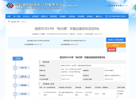 7月23日我公司(河北光源太陽能科技有限公司)在南宮市2019年“電代煤”采暖設備招標項目的競標中,憑借過硬的產品質量,扎實高效的工作作風,卓越的運作團隊和良好的企業信譽,以絕對的優勢順利中標。
