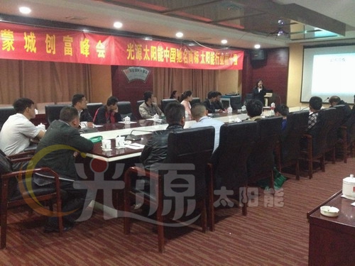 4月21日,光源太陽能安徽蒙城2014年經銷商培訓大會在蒙城國際大酒店舉行,來自蒙城的20余位的經銷商參加了本次會議。