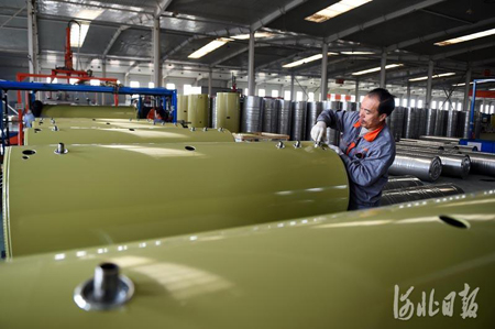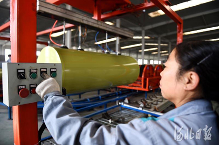 11月10日,河北光源太陽能科技有限公司工人在蓄熱式智能電鍋爐生產線上忙碌。