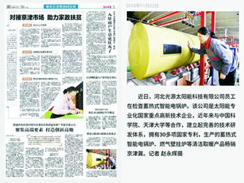 2018年11月22日,河北日報刊登河北光源太陽能科技有限公司生產蓄熱式智能電鍋爐的圖片新聞。